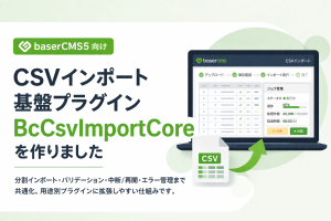 basercms 【baserCMS5】baserCMS5向けCSVインポート基盤 BcCsvImportCore を作りました baserCMS5で繰り返し作りがちなCSVインポート機能を共通化するために「BcCsvImportCore」を開発しました。 安全な大量登録や中断・再開、エラー管理に対応し、用途別プラグインとして拡張しやすい仕組みです。 CakePHP PHP baserCMS5 2026/04/08 20:30