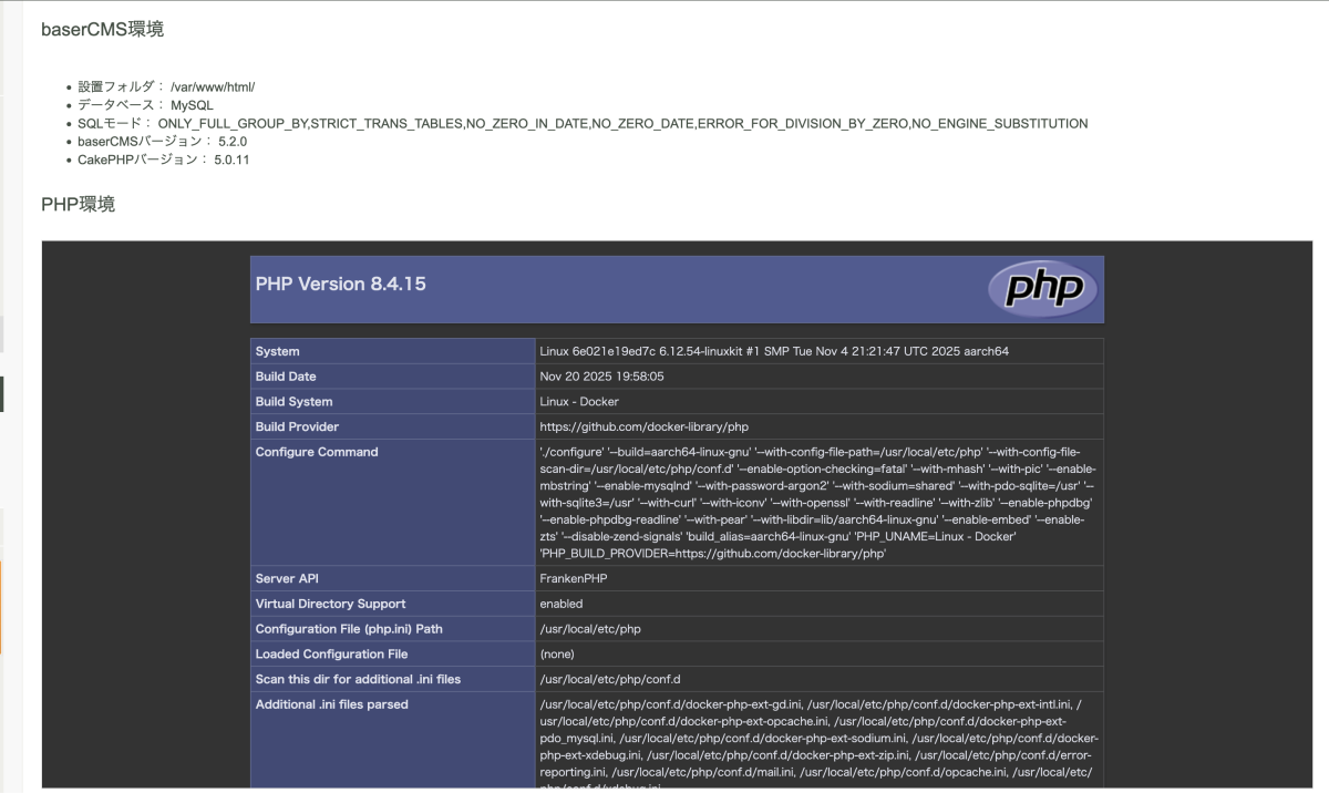今回は、FrankenPHP と baserCMS を Docker 上で構築した環境を紹介しました。