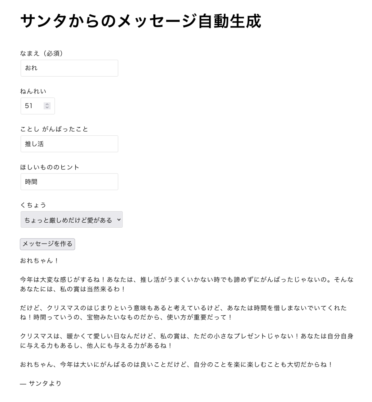 - 「生成する」ボタンを押すと、生成AIを使ってサンタさんからのメッセージが自動生成されて表示されます