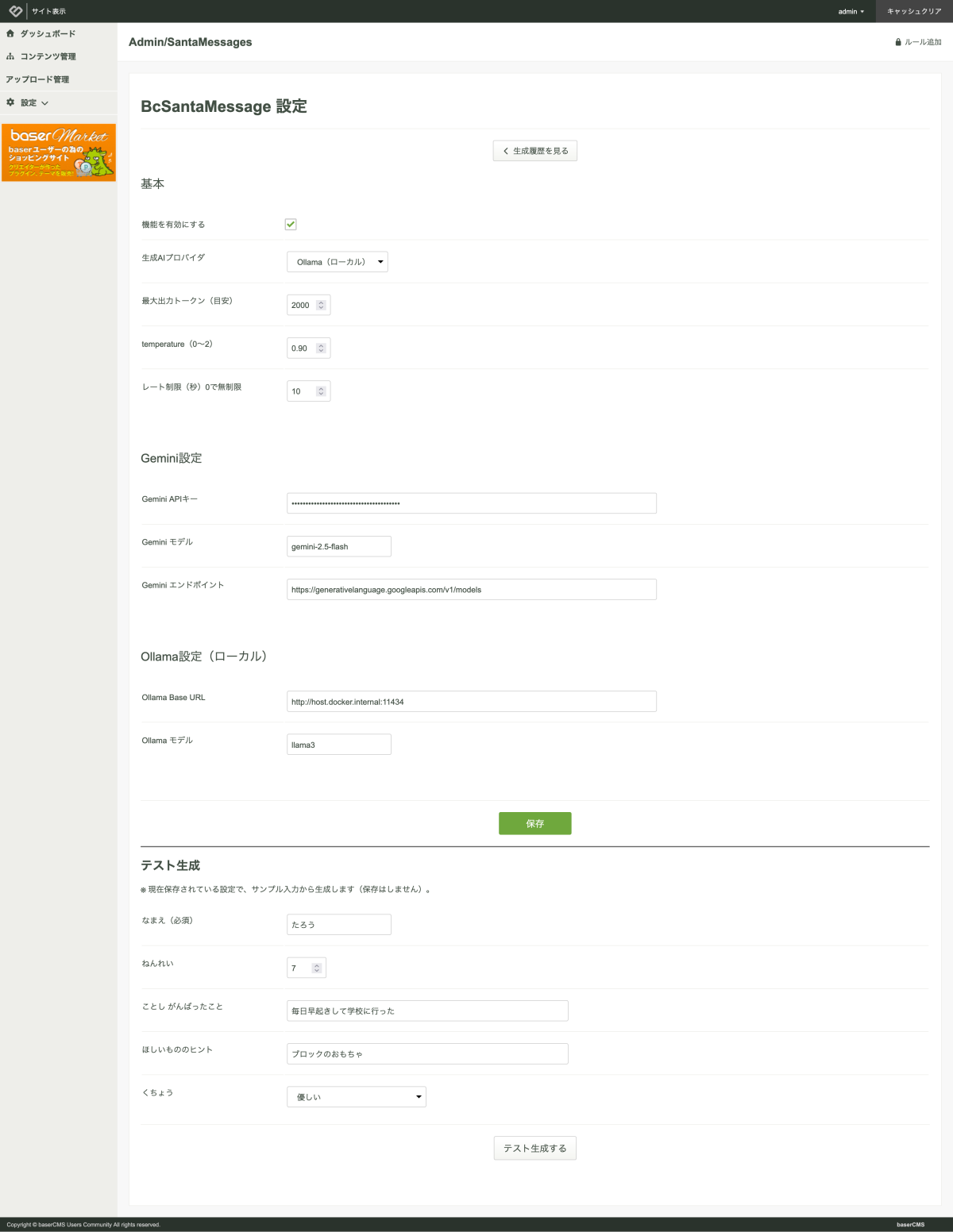生成AI API 連携でサンタからのメッセージを自動生成できるbaserCMS5のプラグイン作って。AIのAPIはできるだけ無料で使えるもので対応できるようお願いします。